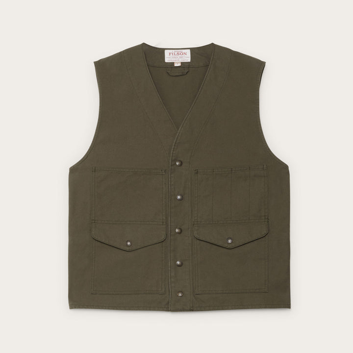 Filson vests are trusted by hunters, ranchers, anglers and loggers – any sportsman or tradesman requiring dependable utility and easy layering. Our men’s vests are purpose-built for their intended application using the best materials and construction. In the workshop or the field, our Filson vests outsmart the elements, performing their job with unfailing reliability. A cornerstone in our array of vests, the Mackinaw Wool vest for men has delivered unmatched versatility, functionality and utility for more than half a century. The locally-sourced all-natural wool provides low-bulk, breathable warmth, dry or wet. The Alcan Canvas Vest, descended from our iconic work vests, is fabricated with heavy-duty waxed canvas and reinforced with ballistic nylon for maximum strength and durability. It’s design blends the pocket configuration of our historic foresters’ vests with a feature set engineered for backcountry moto adventure. For core warmth in the frigid weather, Filson men’s vests are insulated with goose down or cutting-edge synthetics that mimic down’s warmth and compressibility. Our Down Cruiser Vest filled with responsibly-sourced goose down, nature’s warmest and lightest insulation. For work or field vests, hunting, down or fleece vests, Filson’s toolbox is filled with vests ideally engineered for your specific application.