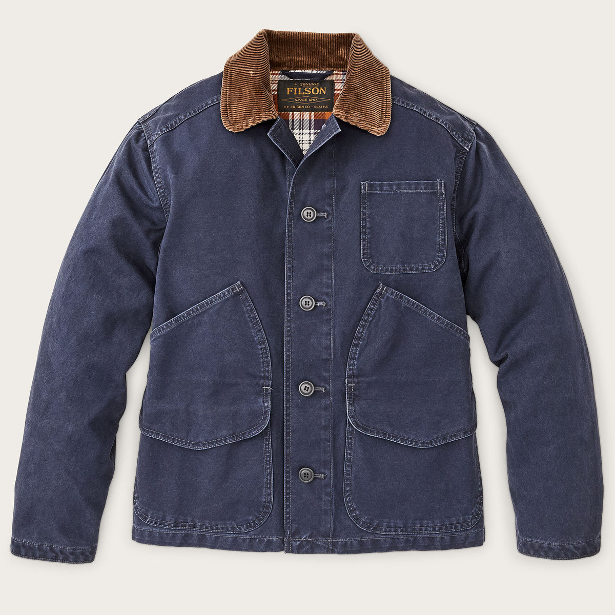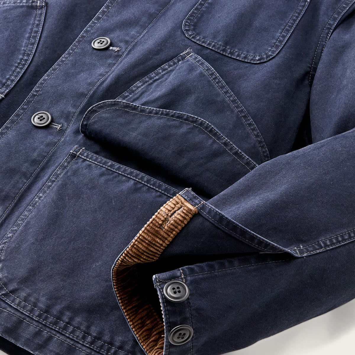 Our Canvas Outfitter Jacket is a straightforward barrier against brush, thorns, and flying wood chips. The sturdy 11-oz. canvas is tightly woven for excellent tear strength and wind resistance. Strong, chip-resistant buttons secure the front closure and adjustable cuffs. The hand pockets double as flaps for the cargo pockets, a design taken from our vintage field coats. Corduroy-lined collar.