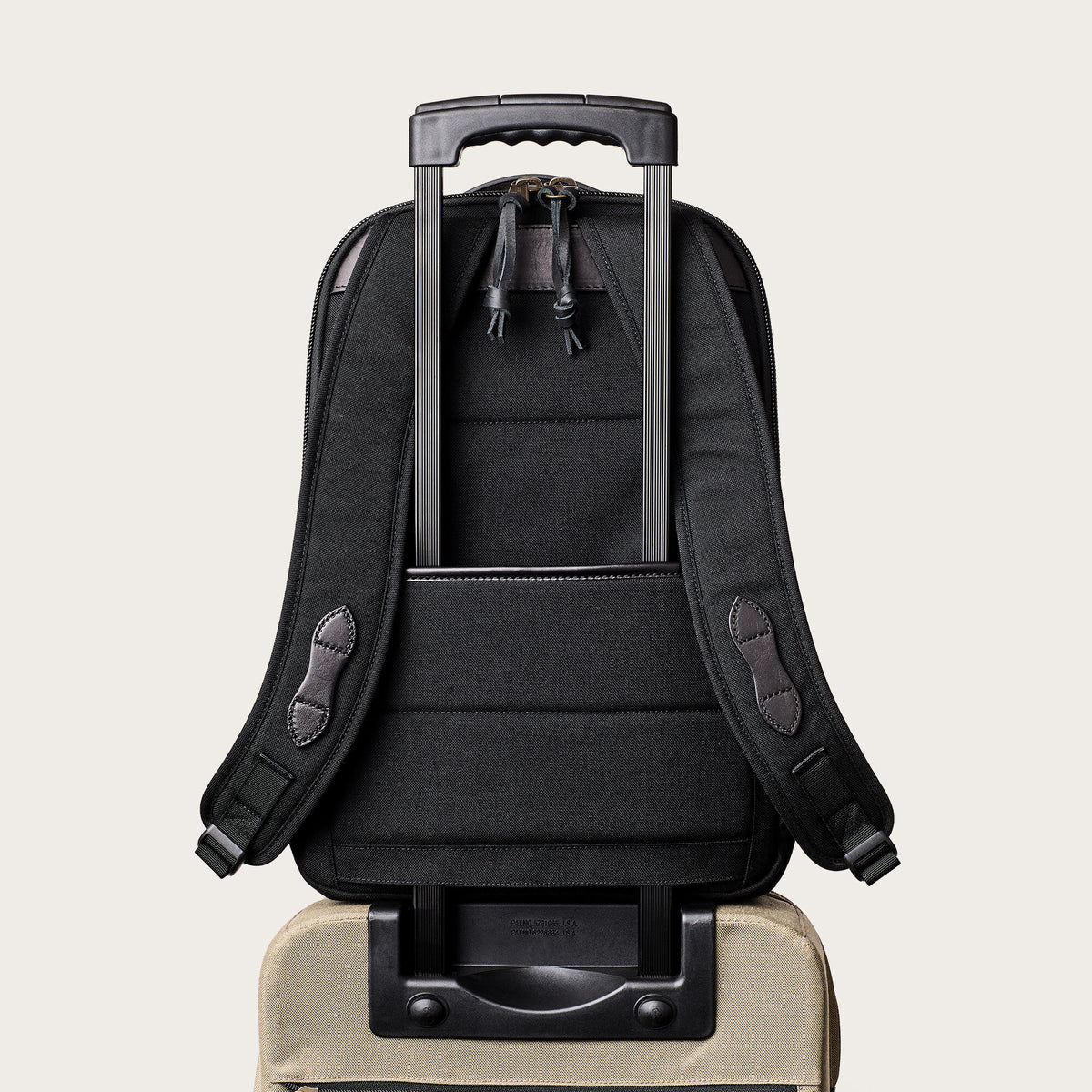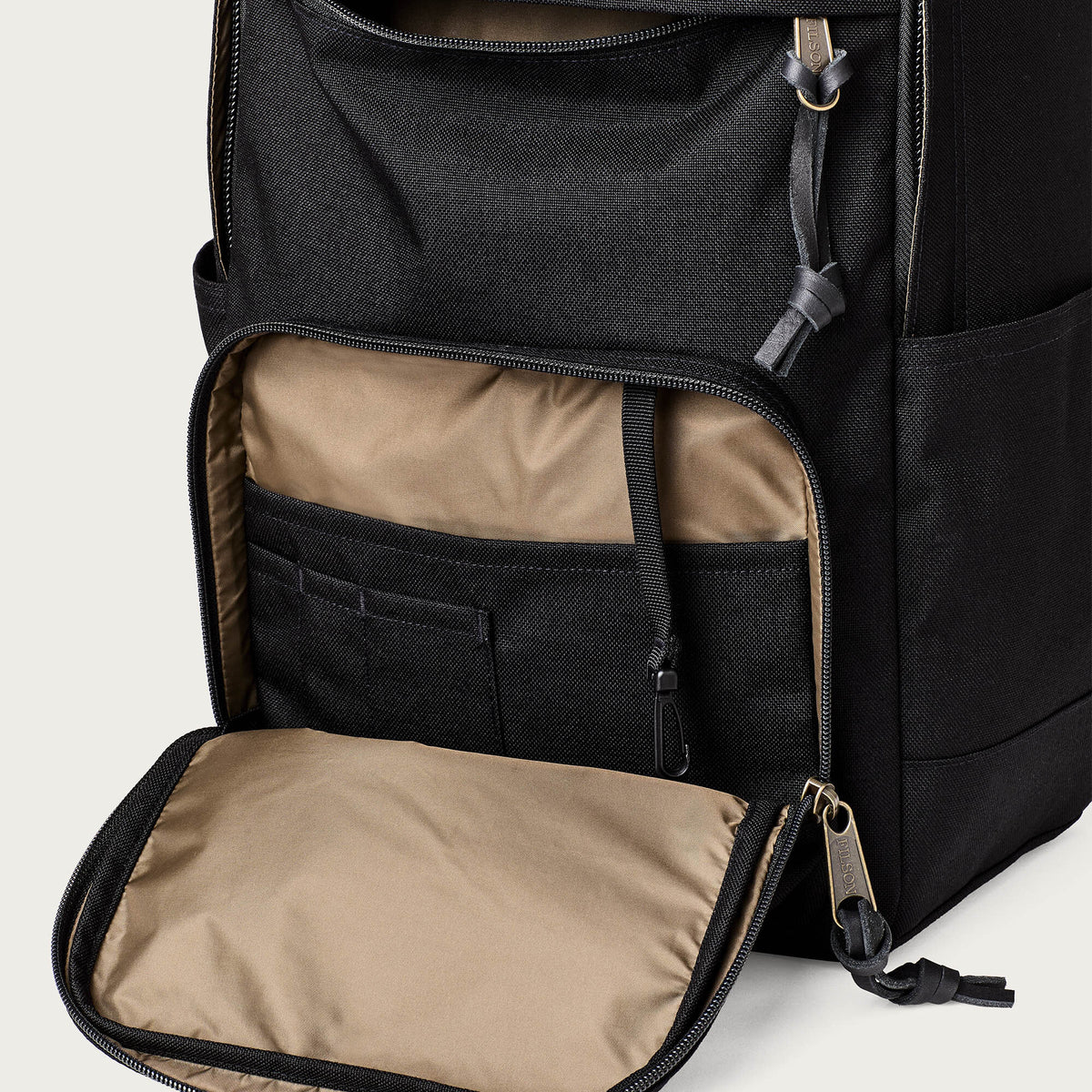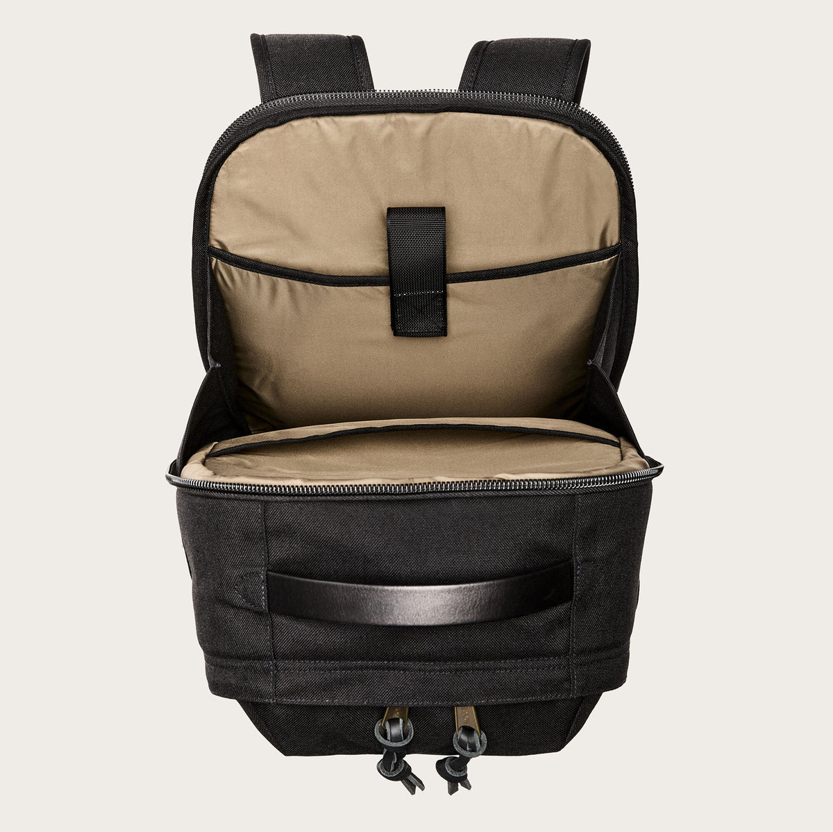 Made to withstand the abuse of travel and daily use, the versatile Filson Dryden Backpack is constructed from weather-resistant 1000D nylon for its ability to withstand long-term abrasion. With the same weave pattern as ballistic nylon, its resistance to tears and punctures is outstanding. Features a double-layer reinforced bottom for added durability. The zippered rear panel provides access to a padded pocket for laptops up to 15". Shoulder straps are ergonomically contoured for carrying comfort. Heavy-duty coil zippers.