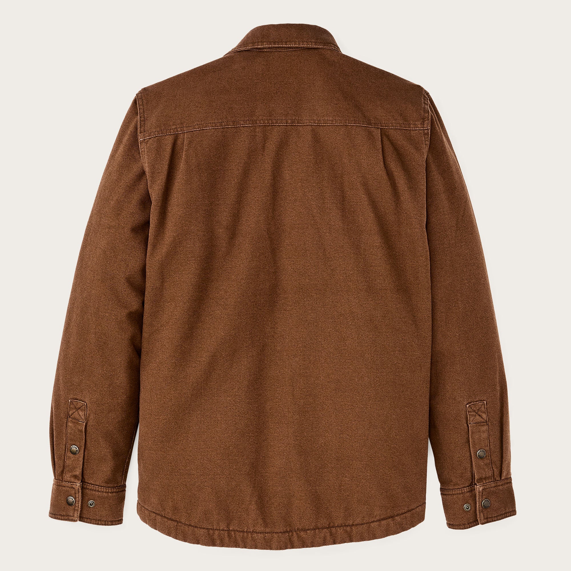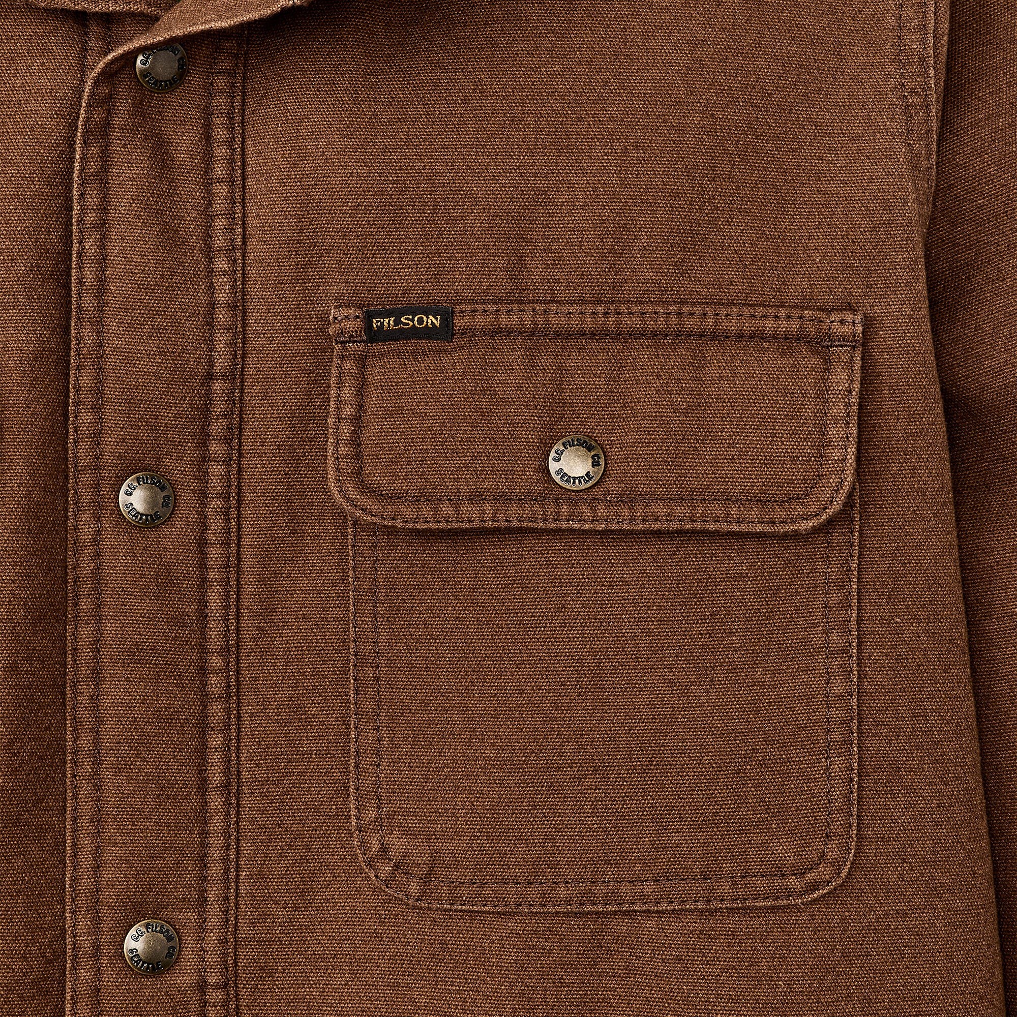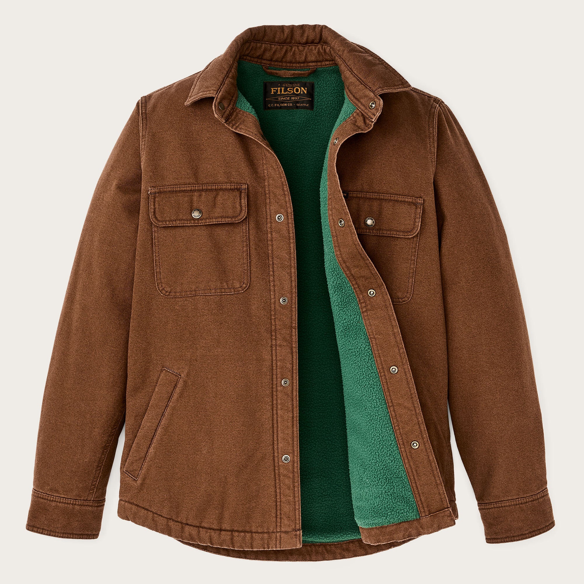 Our Fleece Lined Jac-Shirt bolsters a trusted Filson staple with insulation for colder weather. it's built with sturdy 10-oz. cotton canvas for years of reliable service and lined with fleece in the body and polyfill in the arms. Garment-washed for a well-worn feel from the first wearing. Pleated shoulders for range of motion. Fleece-lined handwarmer pockets.