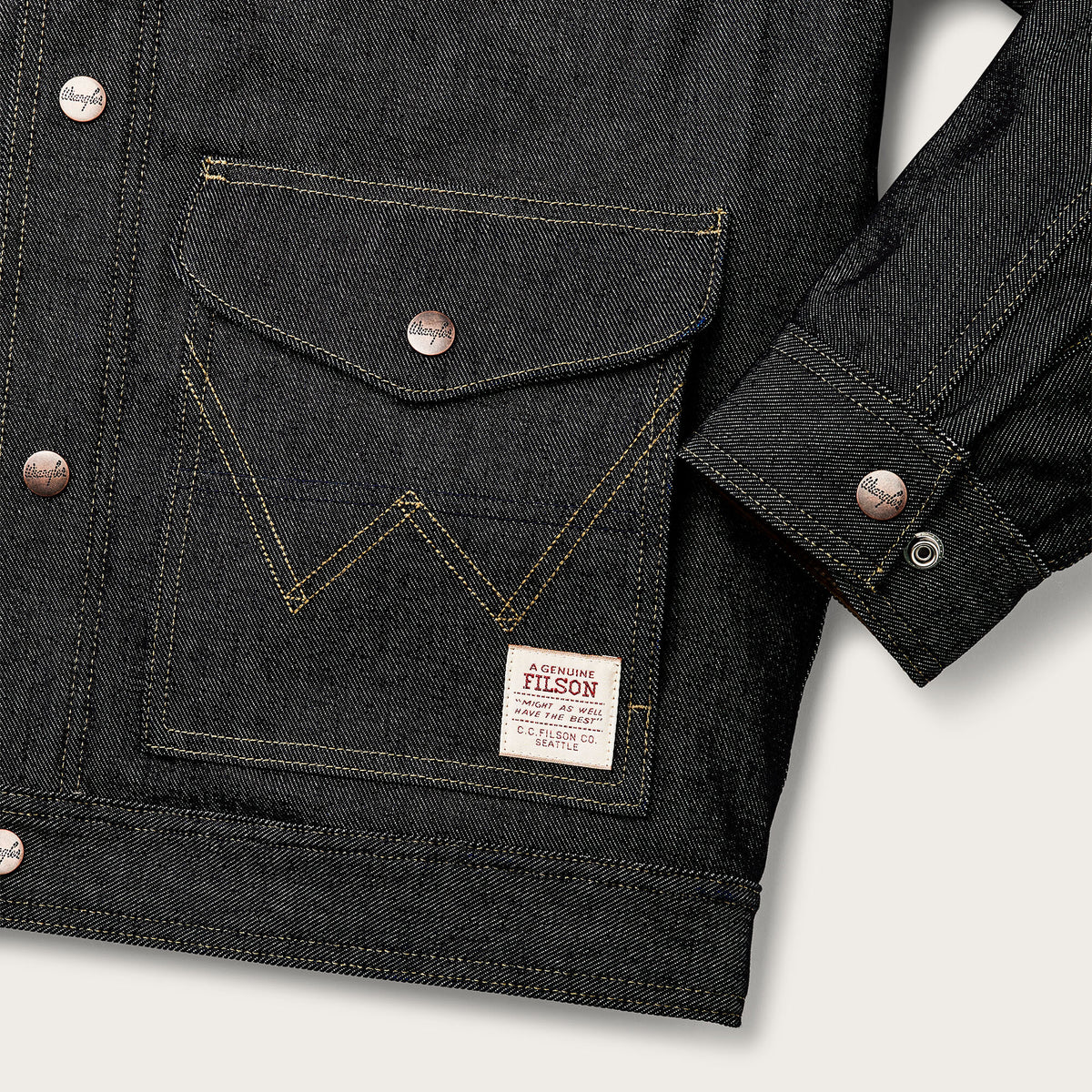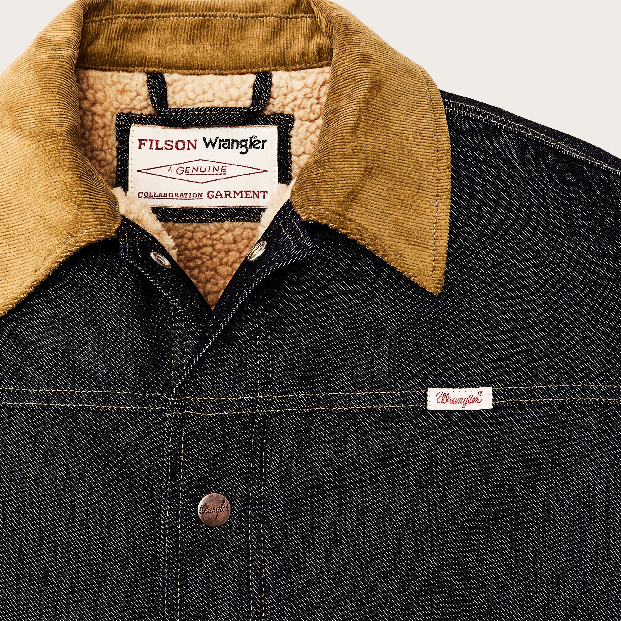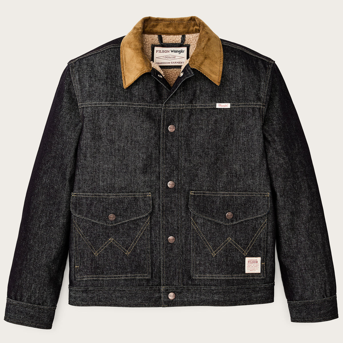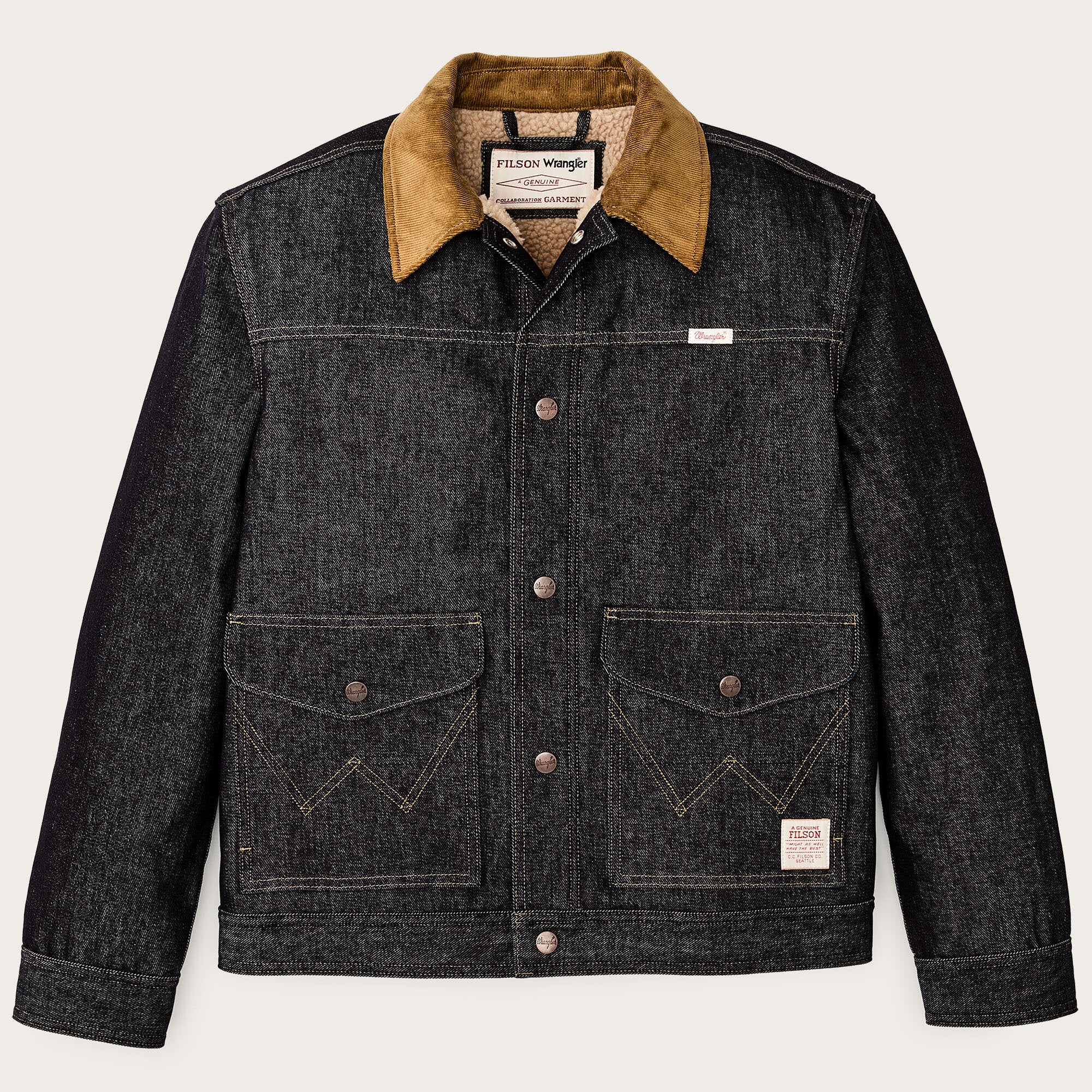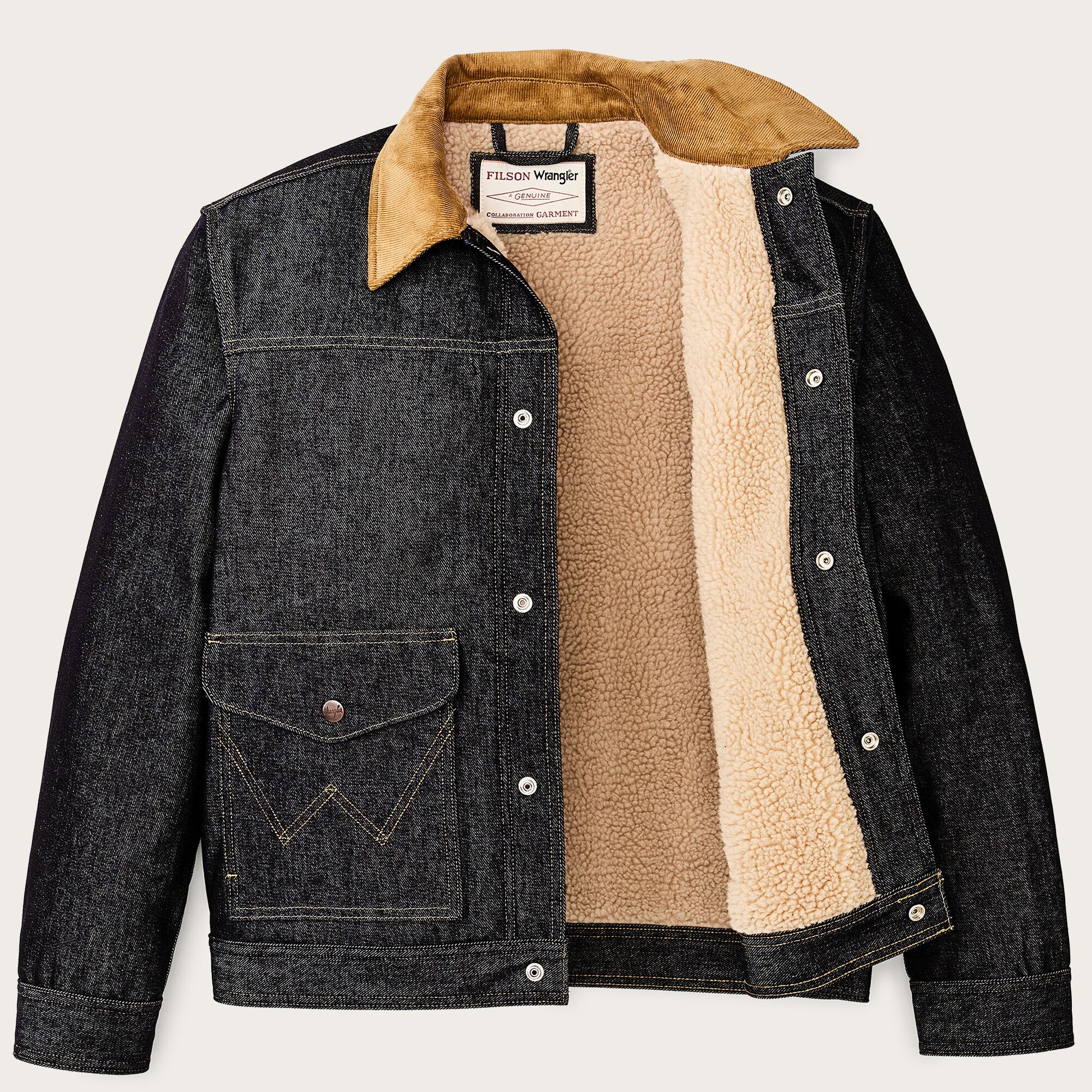 This special-edition collaboration jacket works equally well when roping cattle as it does in the steakhouse after a good day’s work. The strong 14.5-oz. denim resists cold winds and abrasion. Deep-dyed for lasting colors, it will develop its own unique patina with years of use. The torso is lined with high-pile, heat-trapping fleece and the sleeves with easy-layering polyester insulation for cold-weather comfort. The collar is lined with corduroy for next-to-skin comfort when it’s turned up. Wrangler’s signature ‘W’ is embroidered on the pockets. Snap-secure front closure, cuffs, and cargo-pocket flaps.