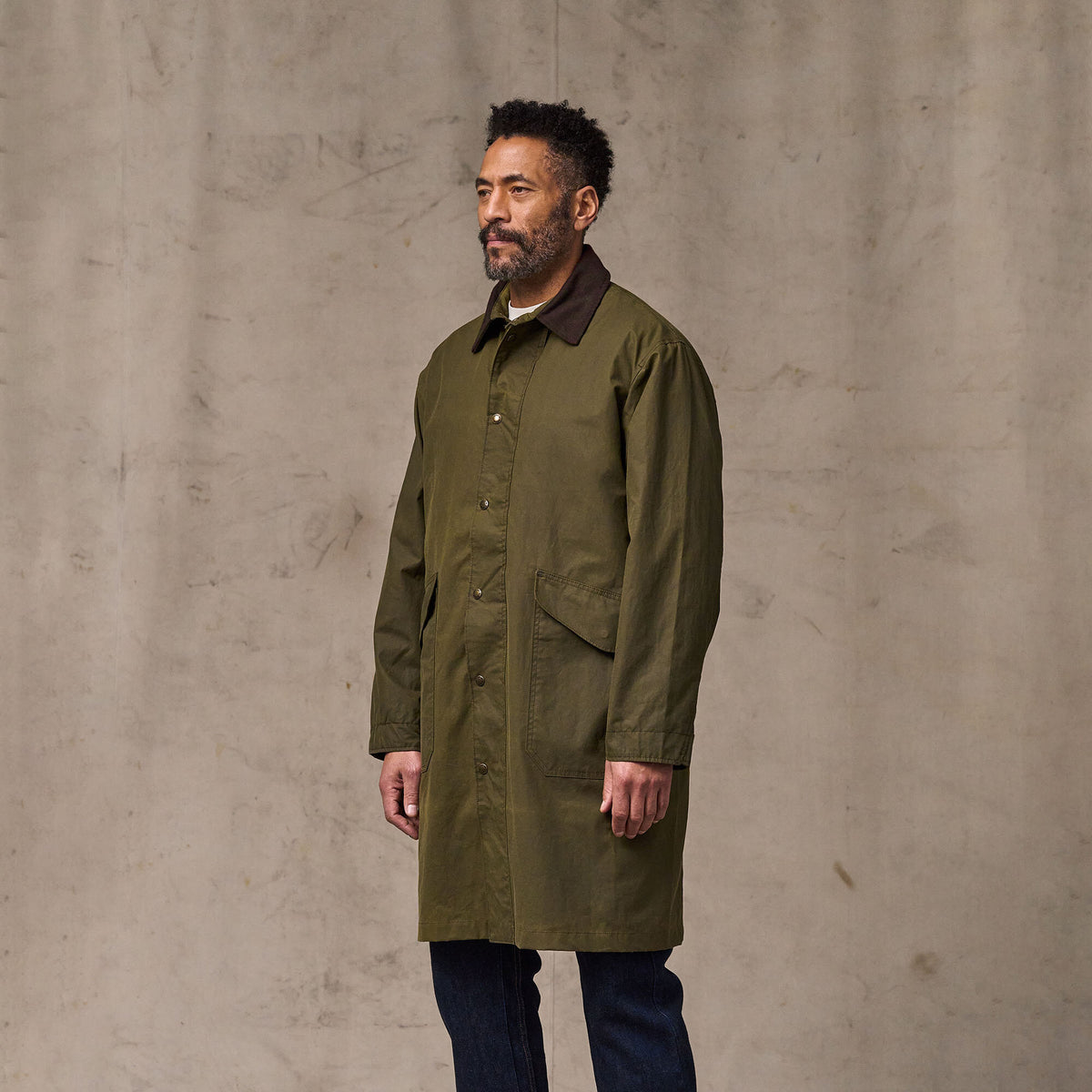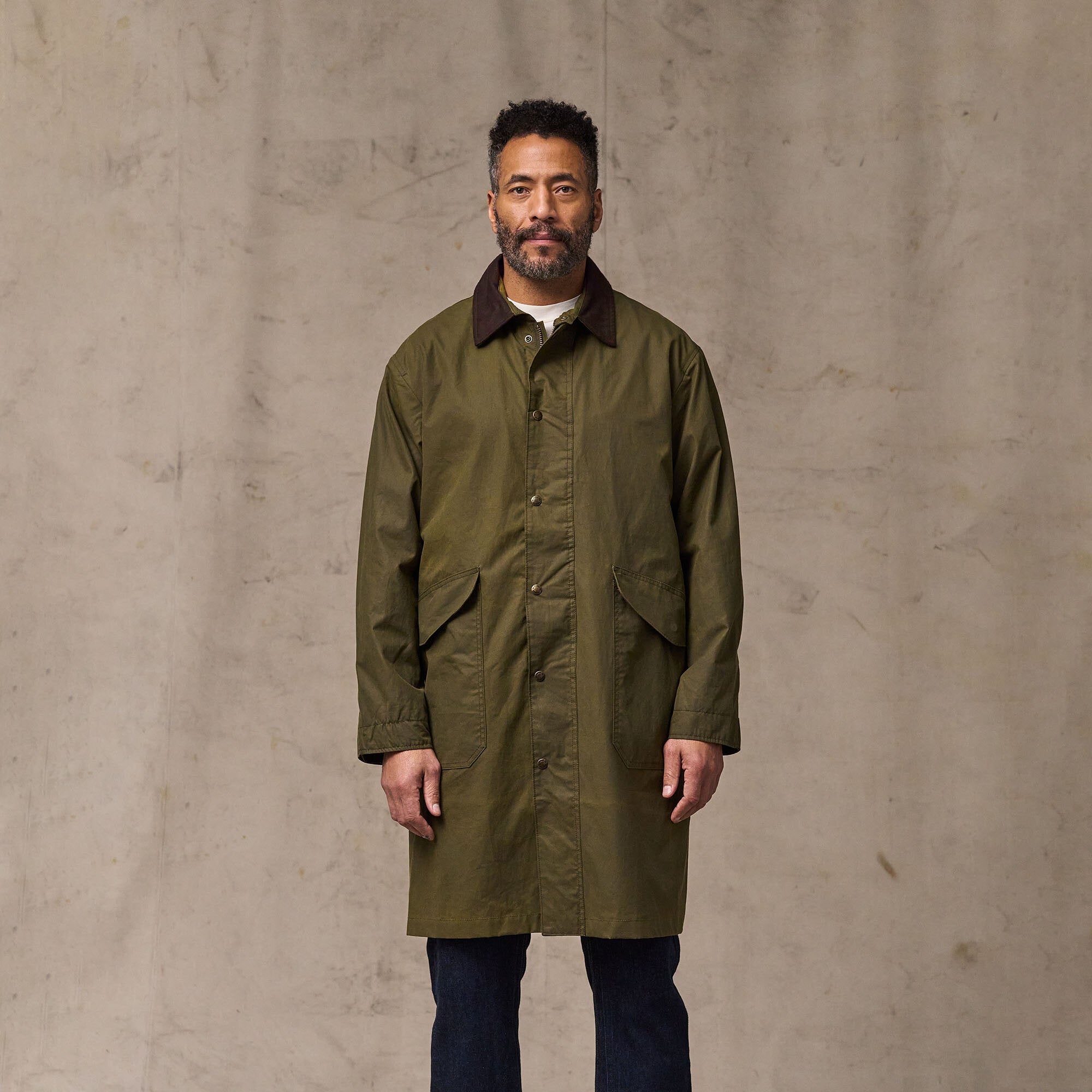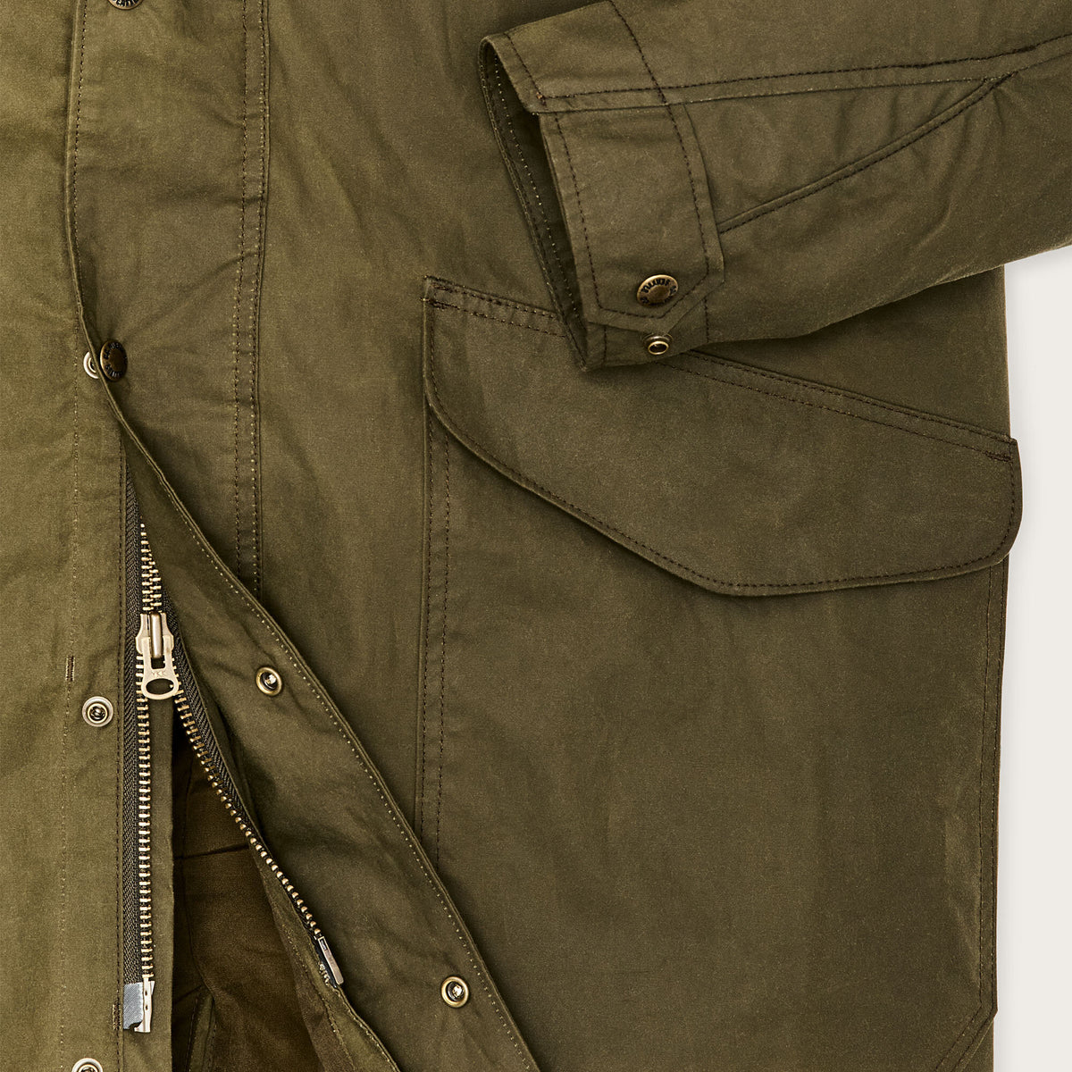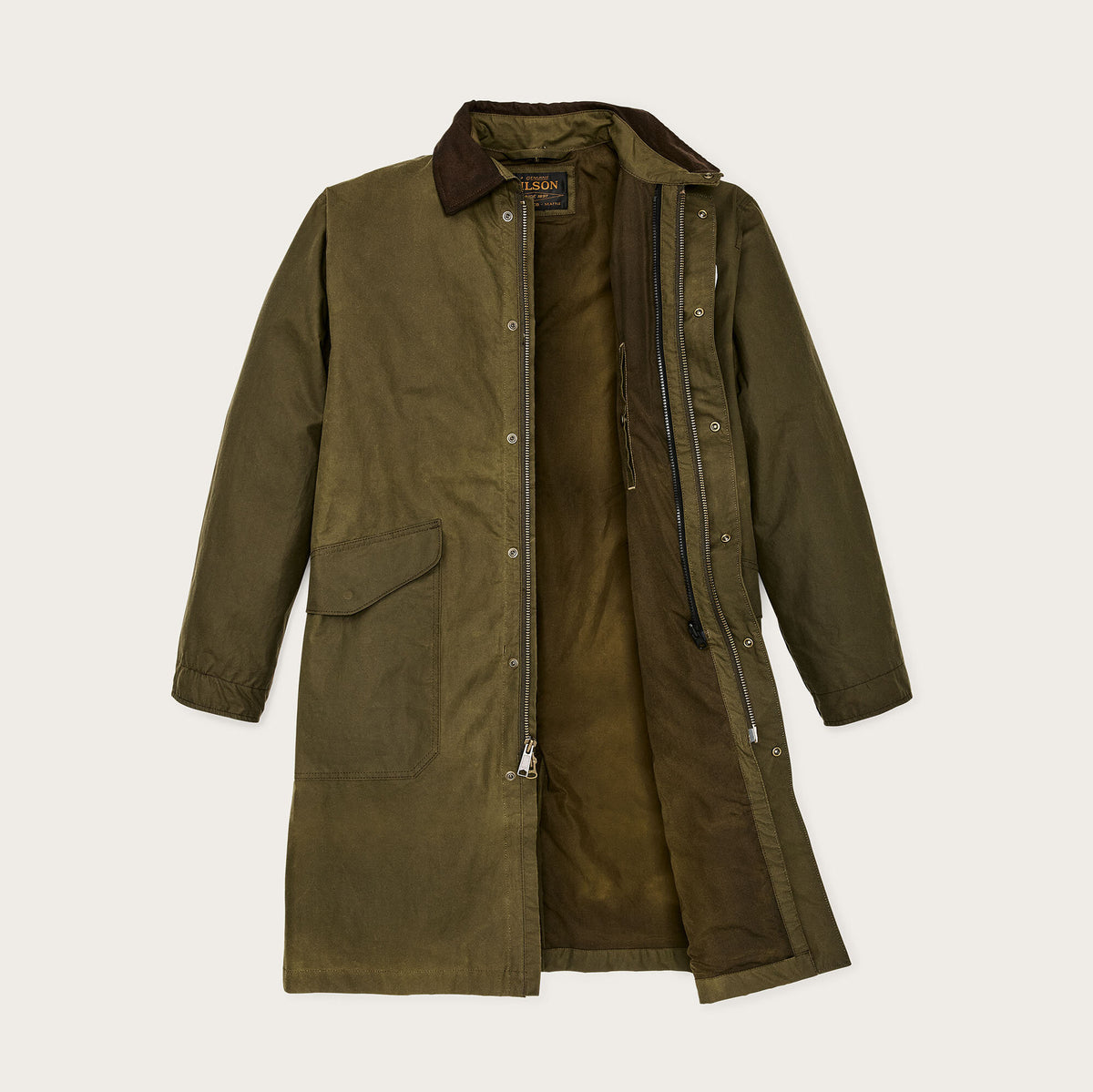 Ein zeitloses Design aus traditionellem Stoff. Die oberschenkellange Silhouette bietet Wetterschutz dort, wo kürzere Jacken enden. Unser charakteristischer Cover Cloth (226,8 g) aus gewachster Baumwolle kann über die Jahre hinweg nachgewachst werden, um seine wasserabweisenden Eigenschaften zu erhalten. Der Zwei-Wege-Frontreißverschluss mit Windklappe reicht bis zur Hüfte und sorgt für optimale Bewegungsfreiheit. Ein langer Schlitz im hinteren Saum ermöglicht ein Aufspreizen der Jacke im Sitzen. Der Rumpf ist mit ungewachstem Cover Cloth gefüttert, während die Ärmel ein Polyesterfutter besitzen, das das Layering erleichtert. Der Kragen ist mit weichem Baumwoll-Moleskin für hohen Tragekomfort gefüttert, die Taschen mit Alaskan Guide Flanell für zusätzliche Wärme. Im Inneren verfügt das Modell über eine Reißverschluss-Sicherheitstasche sowie einen Reißverschluss zur Kompatibilität mit Innenjacken mit Reißverschluss von Filson (separat erhältlich).