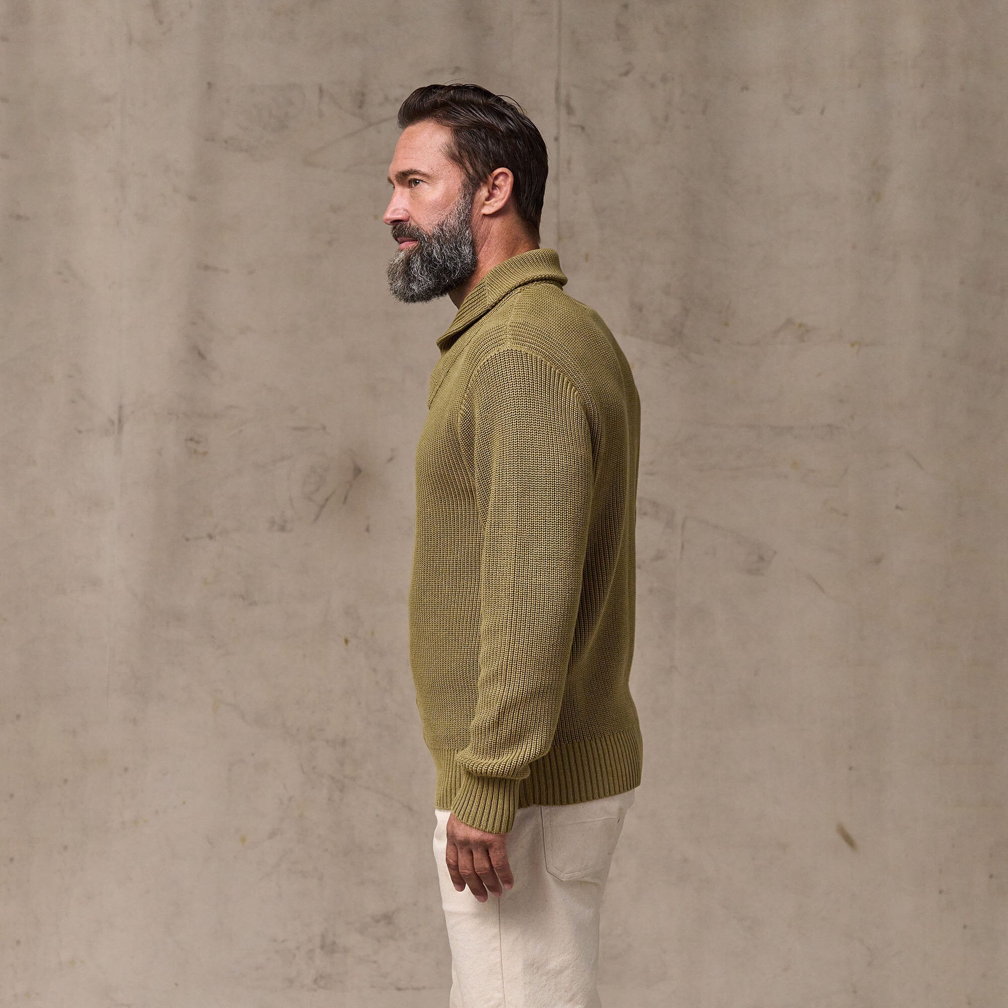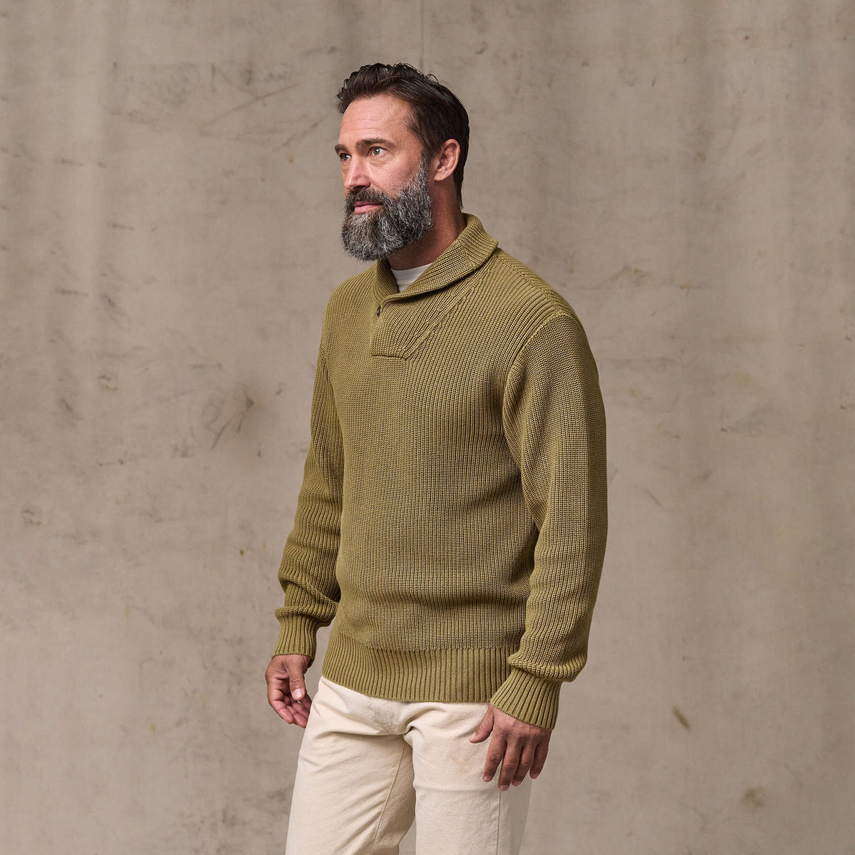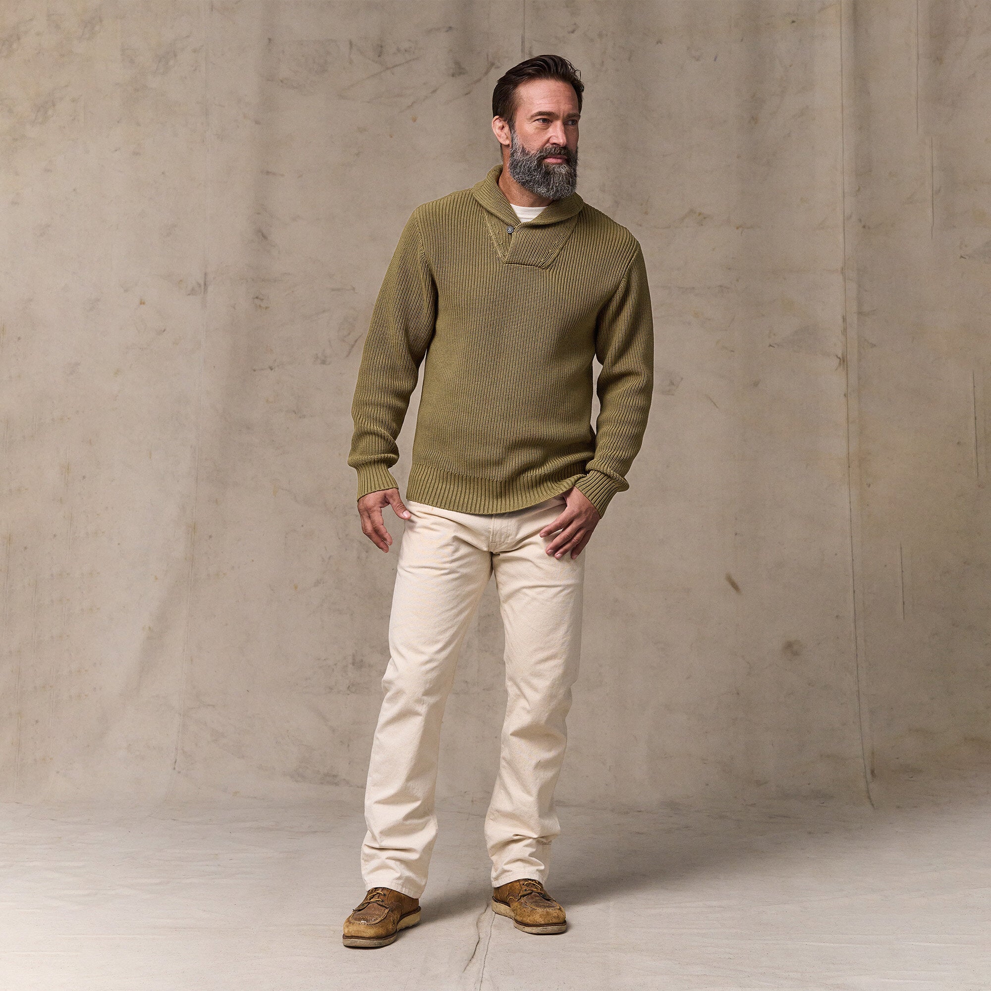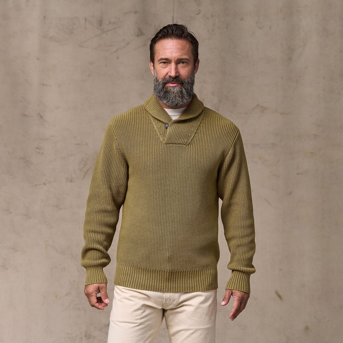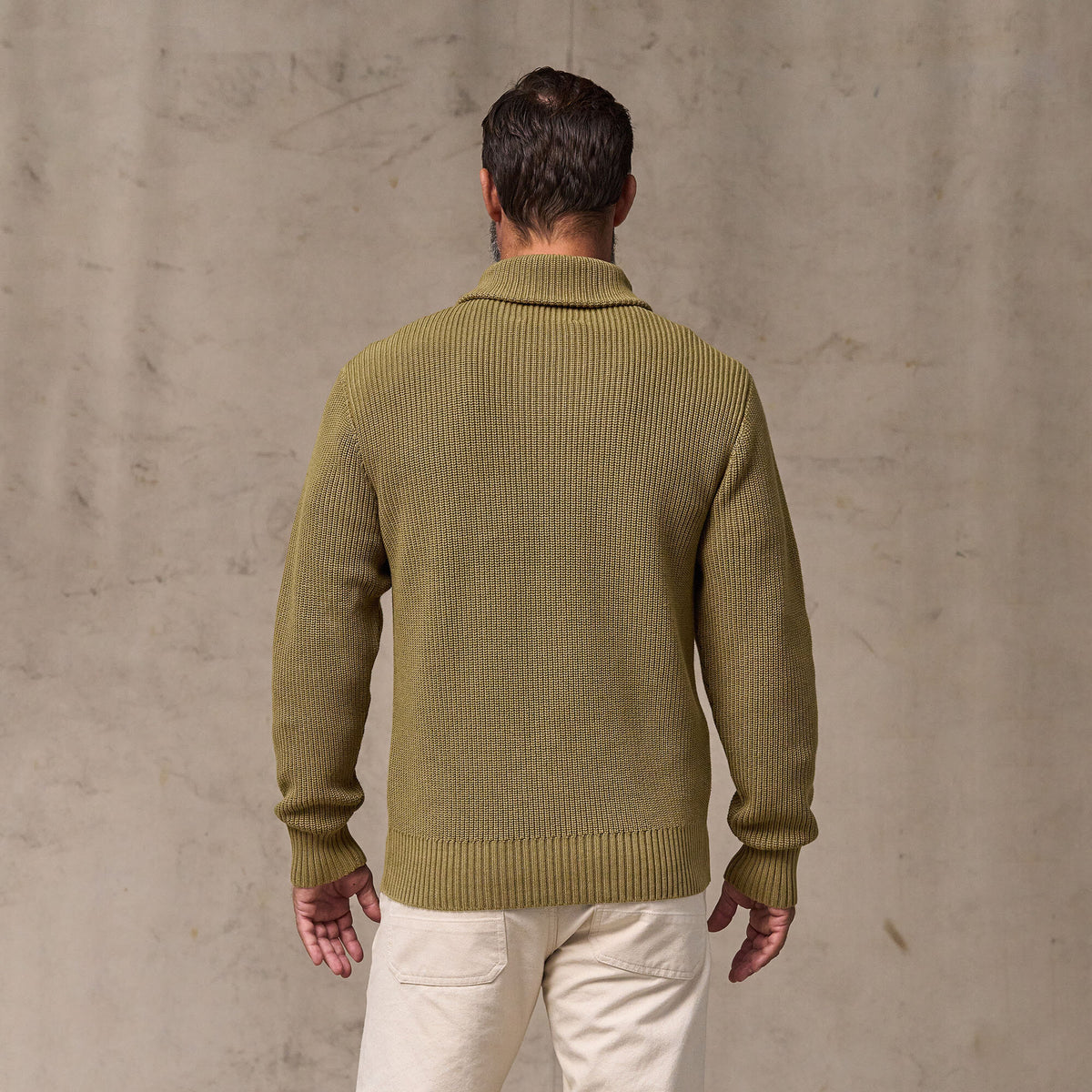 Dieser zeitlose Pullover mit Schalkragen bietet atmungsaktive Wärme bei kühleren Temperaturen. Der Schalkragen lässt sich für zusätzlichen Schutz und Wärme im Nacken hochklappen. Die 7-Gauge-Garne sind in einer offenen, flexiblen Half-Cardigan-Stricktechnik verarbeitet. Ärmelbündchen und Saum aus 2x2-Rippstrick. Der Pullover ist vorgewaschen und bietet vom ersten Tag an ein eingetragenes Tragegefühl. Die leicht vintageartige Optik ist bei jedem Exemplar individuell.