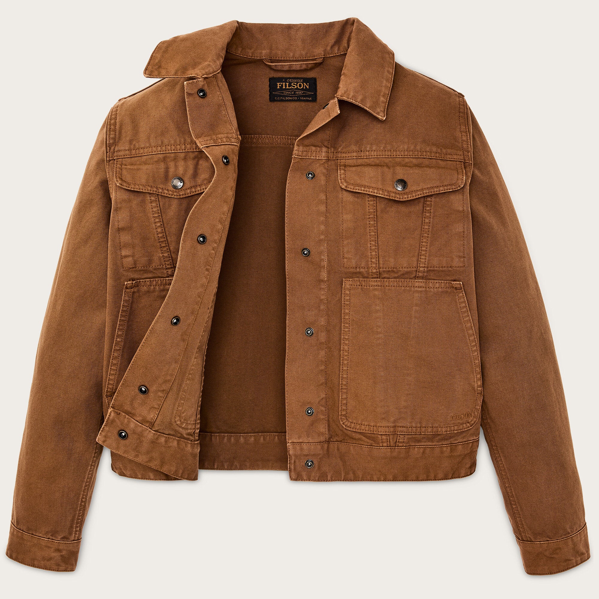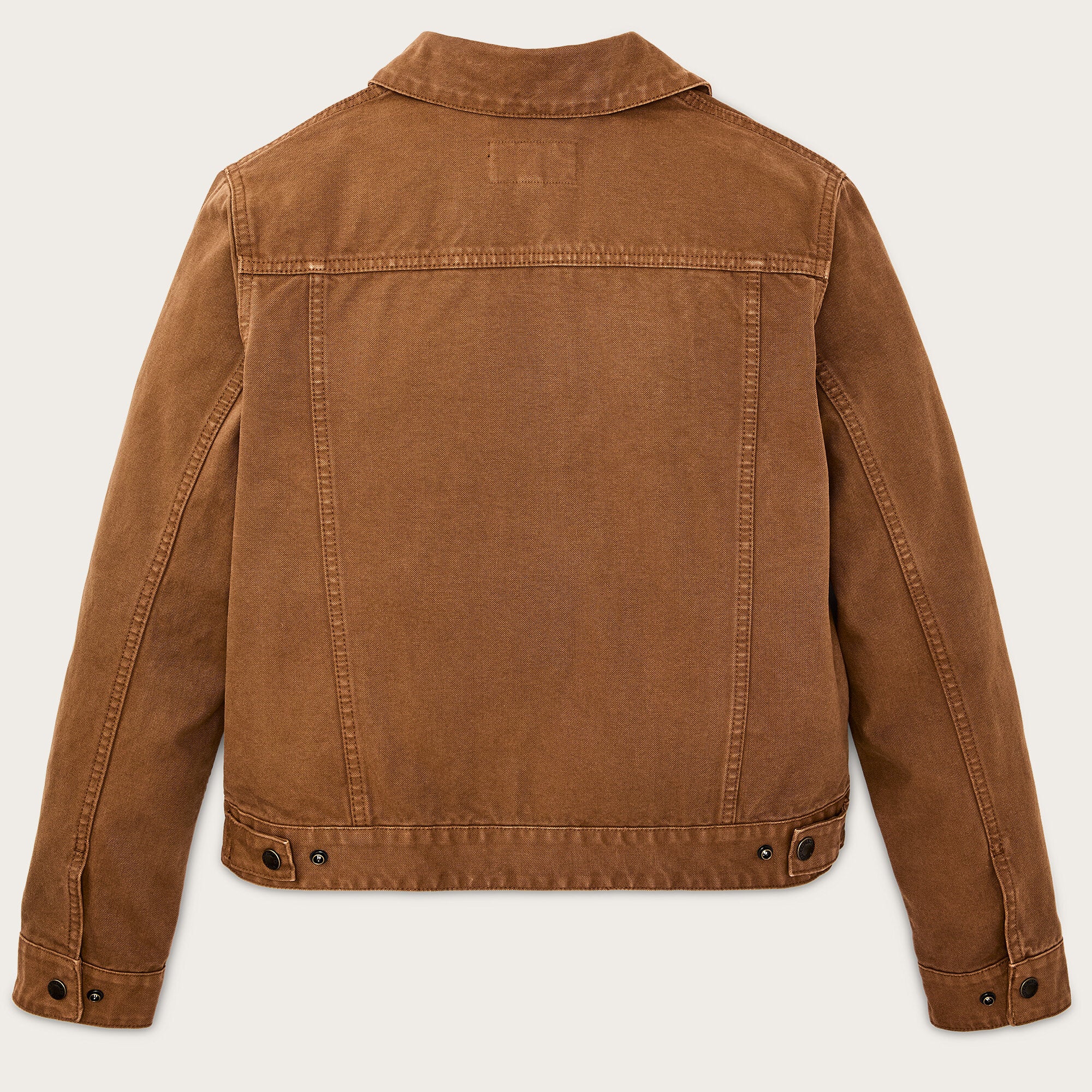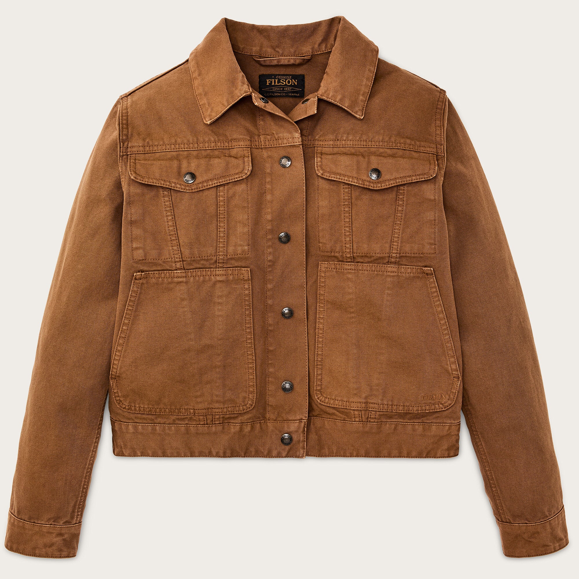 Mit Druckknopfverschluss, verstellbaren Ärmelbündchen und Taille ist das Modell schnell und praktisch für den Feldeinsatz oder in der Stadt. Die taillierte Länge sitzt bequem in der Taille und ermöglicht volle Bewegungsfreiheit beim Fahren, Reiten oder Schleppen von Ausrüstung. Im Stück gefärbt und gewaschen, machen subtile Farbvariationen jede Jacke einzigartig.